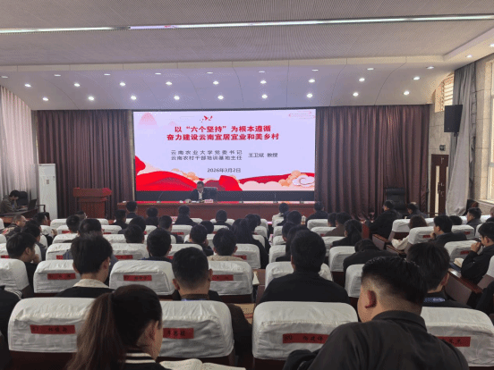 2026年3月2日上午,中共云南农业大学继续教育学院(云南农村干部培训基地)党支部组织全体党员聆听了校党委书记、云南农村干部培训基地主任王卫斌教授为基地2026年春季学期第一期培训班学员讲授题为《以"六个坚持"为根本遵循 奋力建设云南宜居宜业和美乡村》的"开学第一课"。